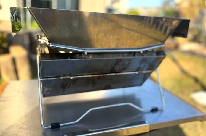 お次は、焚火調理といえばの「焚火グリル」です。が、「おでん鍋」はサイズ的にちょっとミスマッチ。画像の通り、やや鍋が前傾して水面が大きく傾いてしまいました。