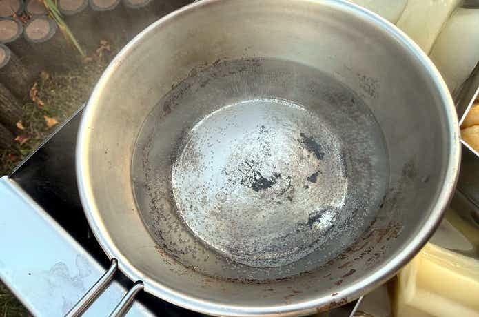 まずは、シェラカップに100ml程度の水を入れ、おでんを空にした区画にセット。周りがスープでやや心配になりますが、やはり炭火だからか、10分もせずに水がフツフツと沸き……、
