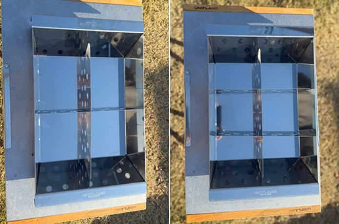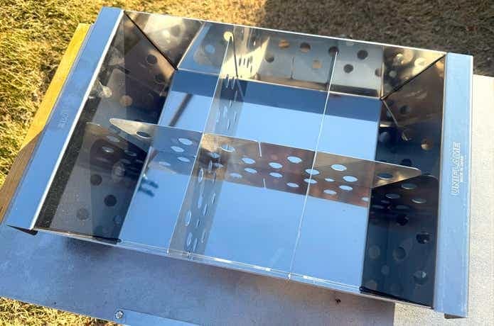 そして、底面は完全にフラット。なので、「ユニセラ」に限らず、同社の「UFタフグリル」「ファイアグリル」「焚火グリル」など、さまざまな火器に置いて使えます。