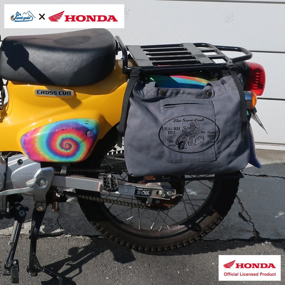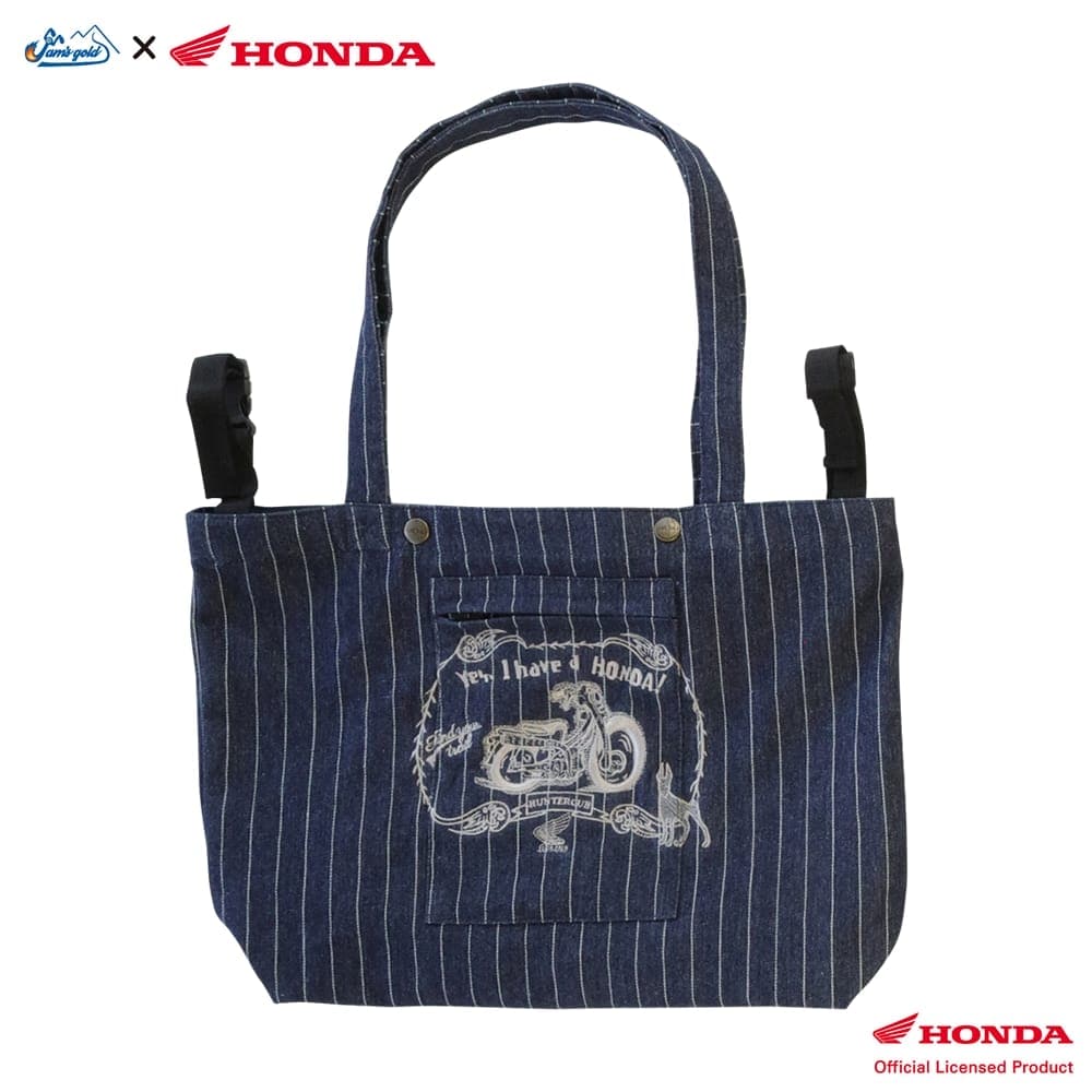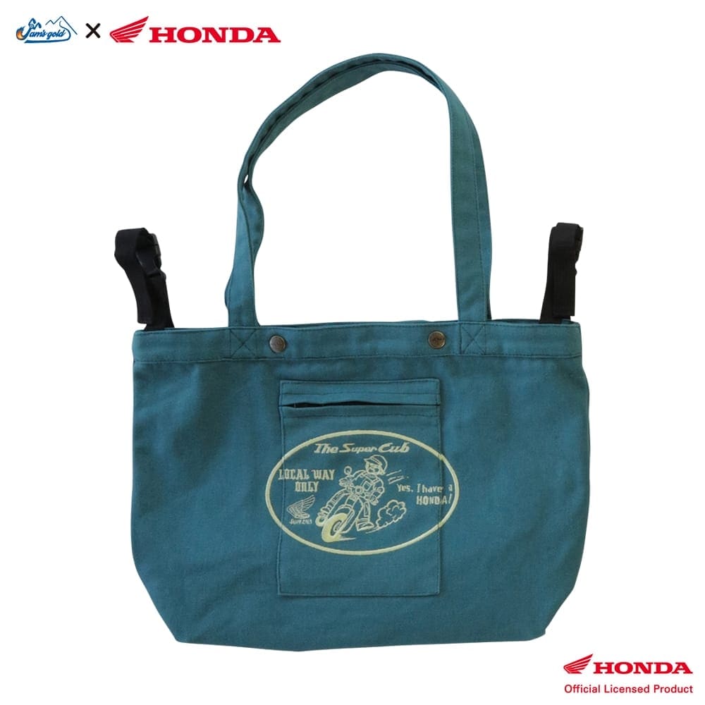 一見普通のト―トバックだがバックルループをハンドルにぶら下げて簡単に取付できるサイクルトートバック。特にカブ乗りに人気のギヤにHondaロゴを落とし込んだ。