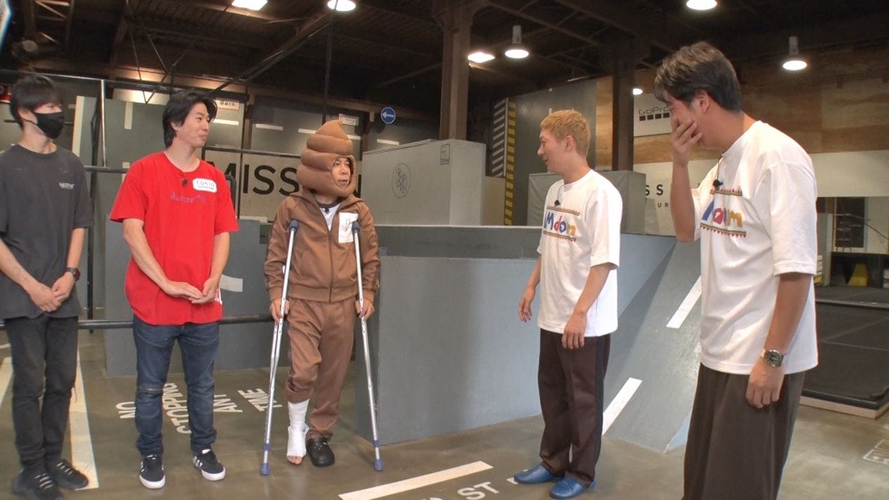 第1話で大けがを負ってしまった岡村。第2話では、その翌日にニューヨーク・嶋佐、屋敷がパルクールの練習場を訪問するが、2人は岡村のけがを知らず、右足首を包帯で固定し、松葉杖姿の岡村を見て「最悪の出だしだ…」「かわいそう」と驚き、「こんな波乱な幕開けあります?」(屋敷)、「俺、最初ふざけて出てきたと思ったんですよ」(嶋佐)とドッキリのようなリアクションを見せる。