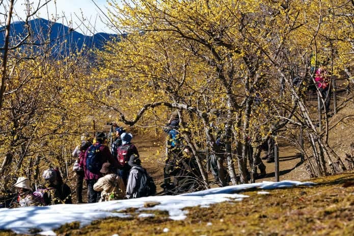 標高497mの山頂一帯に約3,000本が咲き、1月下旬から2月下旬にかけて見頃を迎えます。可憐な黄色い花と、ほのかに漂う甘い香り。冬山特有の静けさの中で、心がゆっくりほどけていく感覚を味わえます。