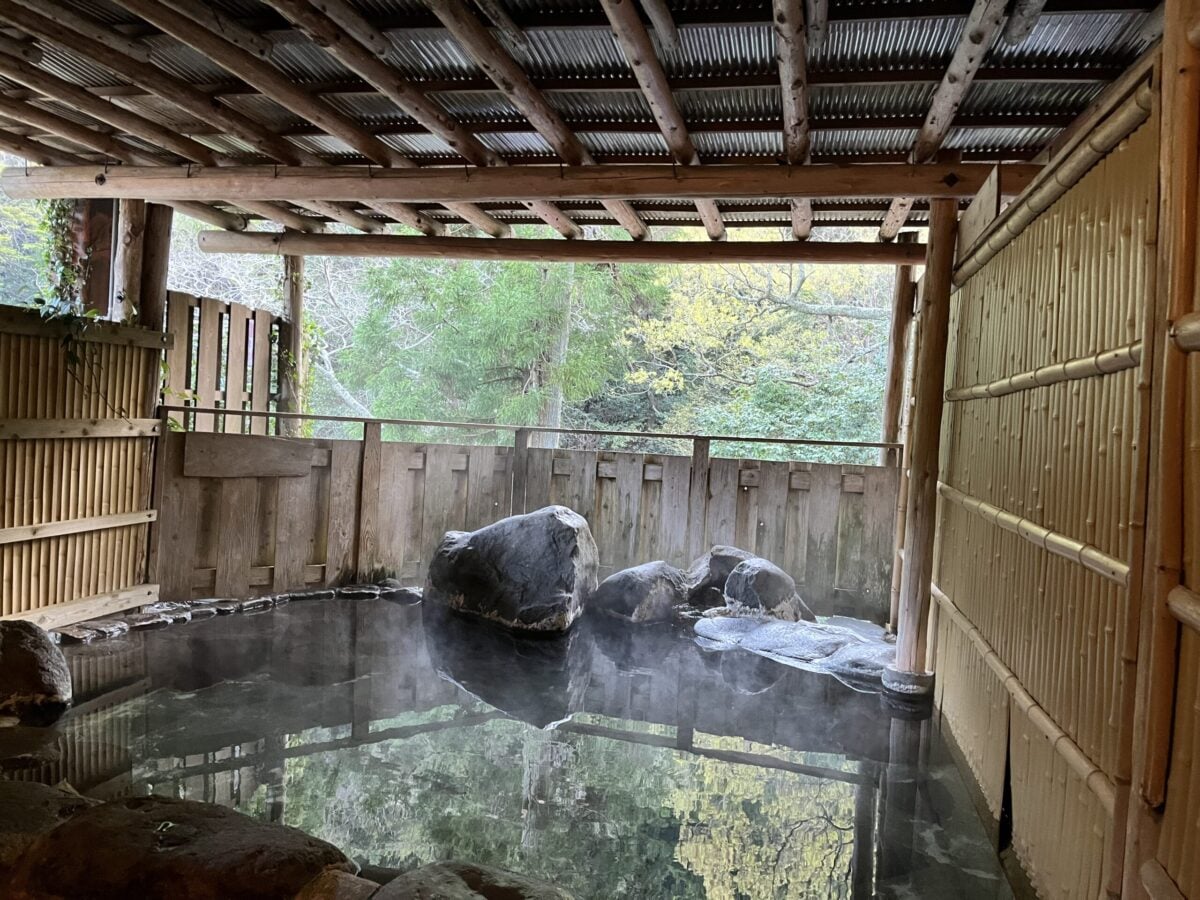 目覚ましに朝から24時間無料の快適な露天風呂へ。あぁ~、こわばってた体がほどけますねぇ。
