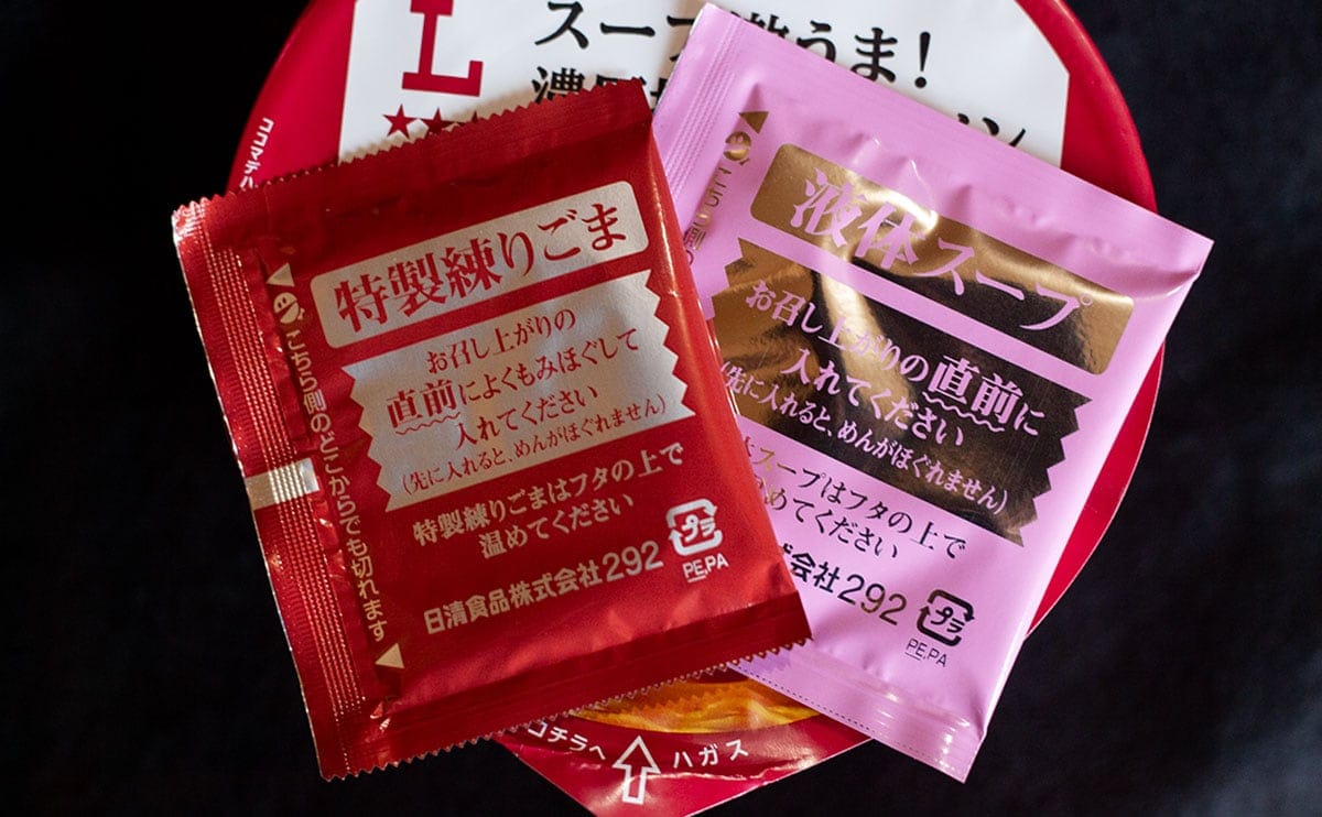 お湯を注いで待つこと4分。先ほど出てきた「特製練りごま」と「液体スープ」の2つを加えて、よく混ぜたら完成です。