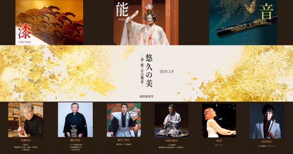 能の舞台と漆芸、そして蒔(まき)絵の楽器。日本の伝統文化を代表する異なる分野が、一つの舞台で響き合う公演、「悠久の美 ― 漆・能・音の饗宴」が2月8日(日)、東京・GINZA SIX地下3階の観世能楽堂で開催される。Art&Scienceシンフォニー協会(東京)が主催。