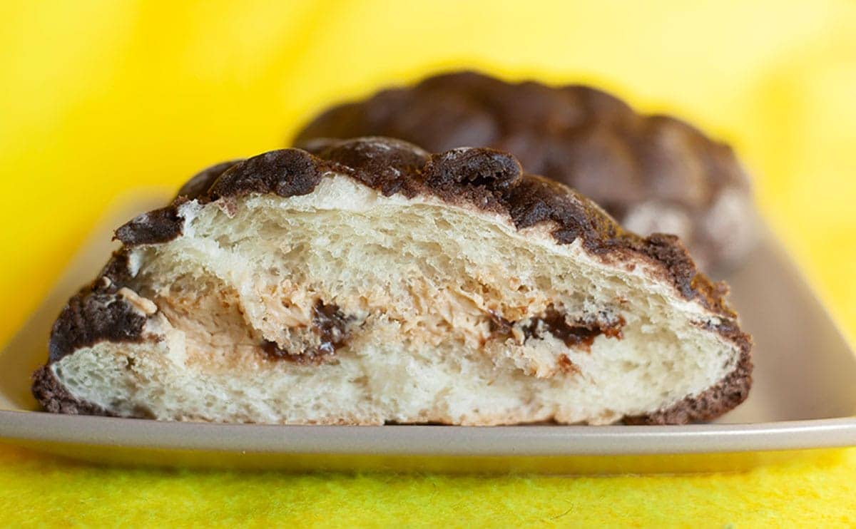 続いて、半分に切って中を確認してみました。真ん中にあるベージュっぽいやつがヘーゼルナッツホイップで、さらにその中に見える茶色のやつがヘーゼルナッツチョコクリームです。