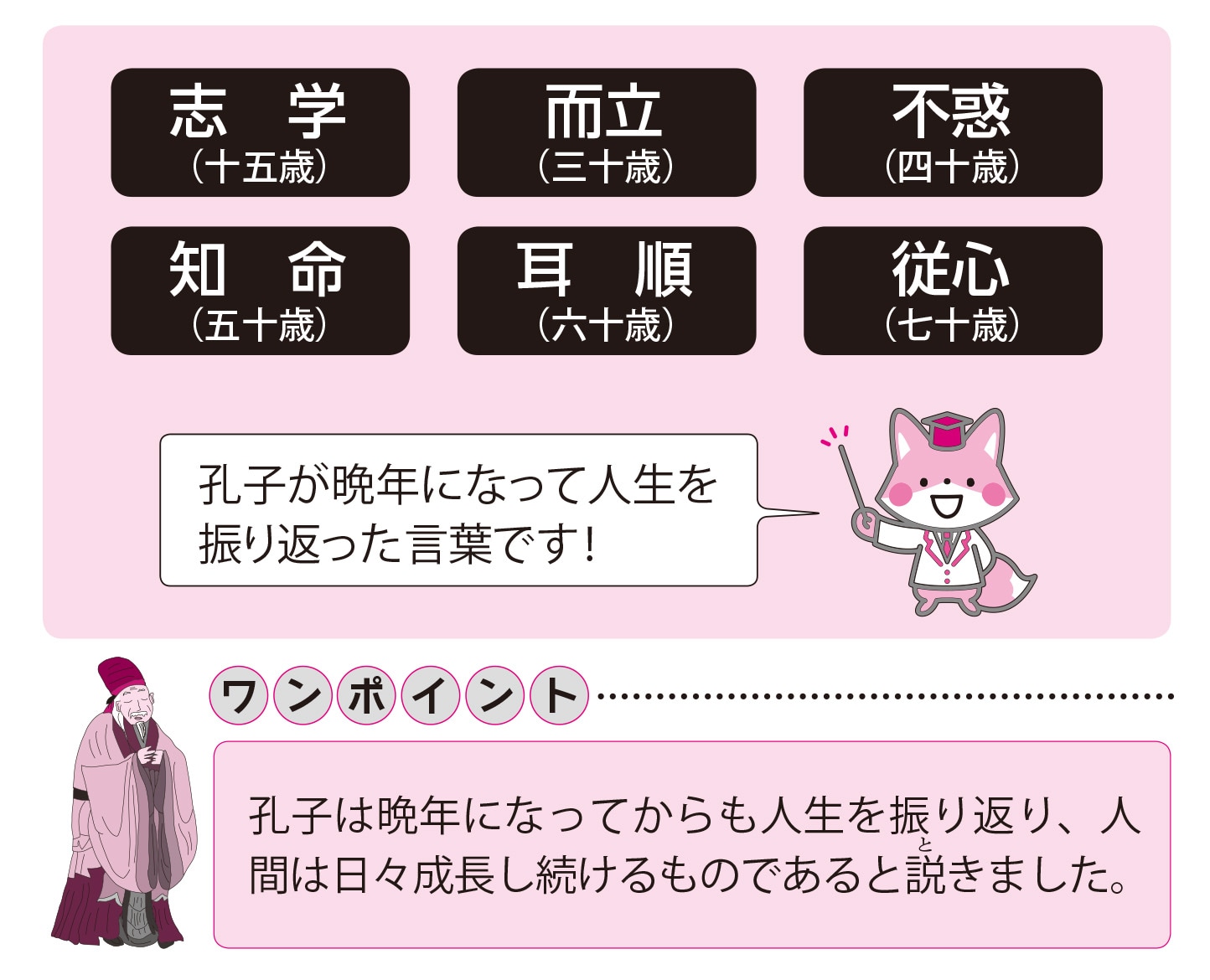 孔子が晩年になって、人生を振り返った言葉として有名です。ここから、十五歳を「志学(しがく)」三十歳を「而立(じりつ)」、四十歳を「不惑(ふわく)」、五十歳を「知命(ちめい)」、六十歳を「耳順(じじゅん)」、七十歳を「従心(じゅうしん)」というようになったのです。