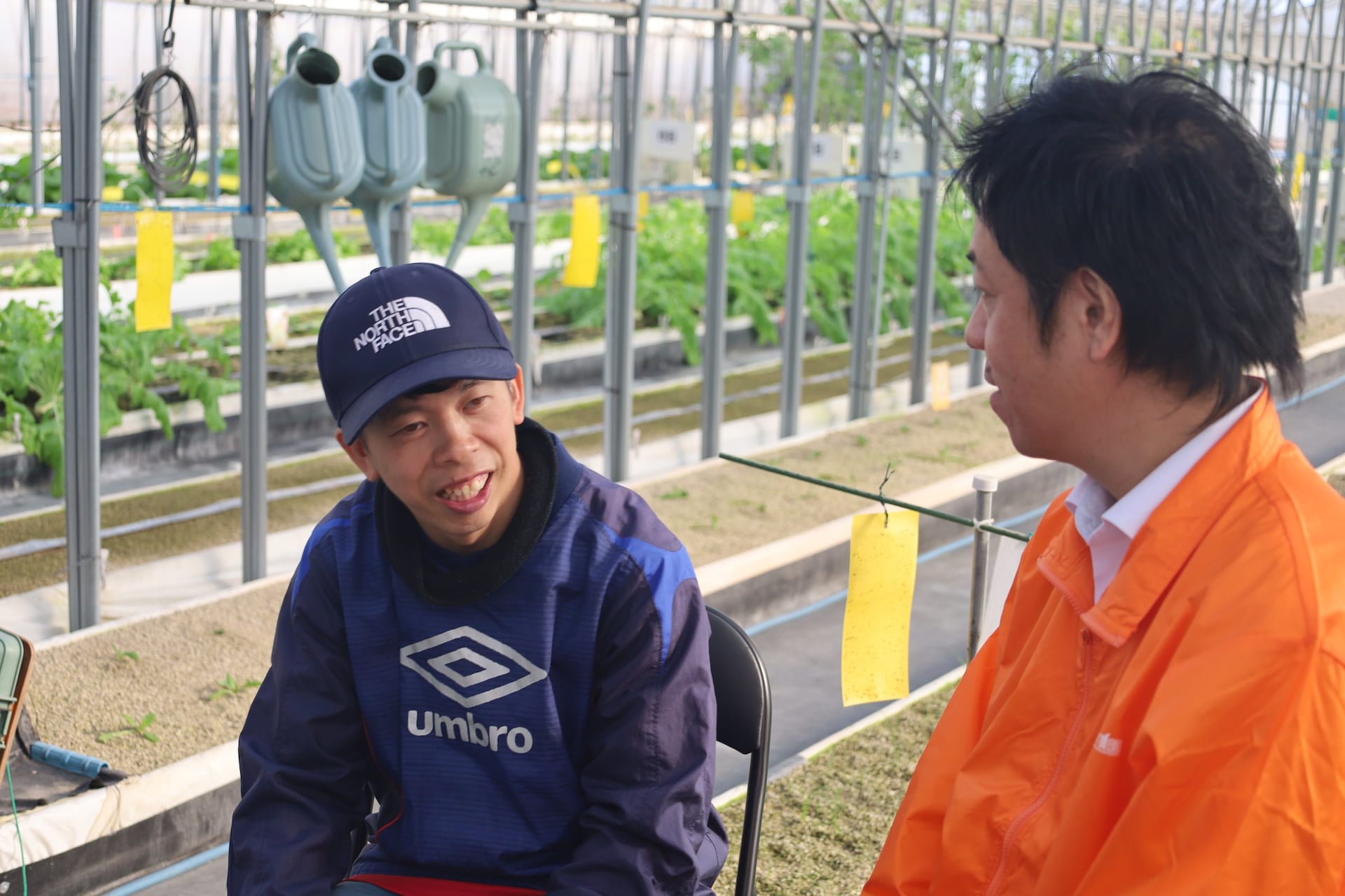 この日訪ねたのは、事業を率いる大橋王二(おおはし・おうじ)社長。現場の農園では、上谷周人(かみたに・しゅうと)さんと重田洋平(しげた・ようへい)さんが農作業にいそしんでいた。