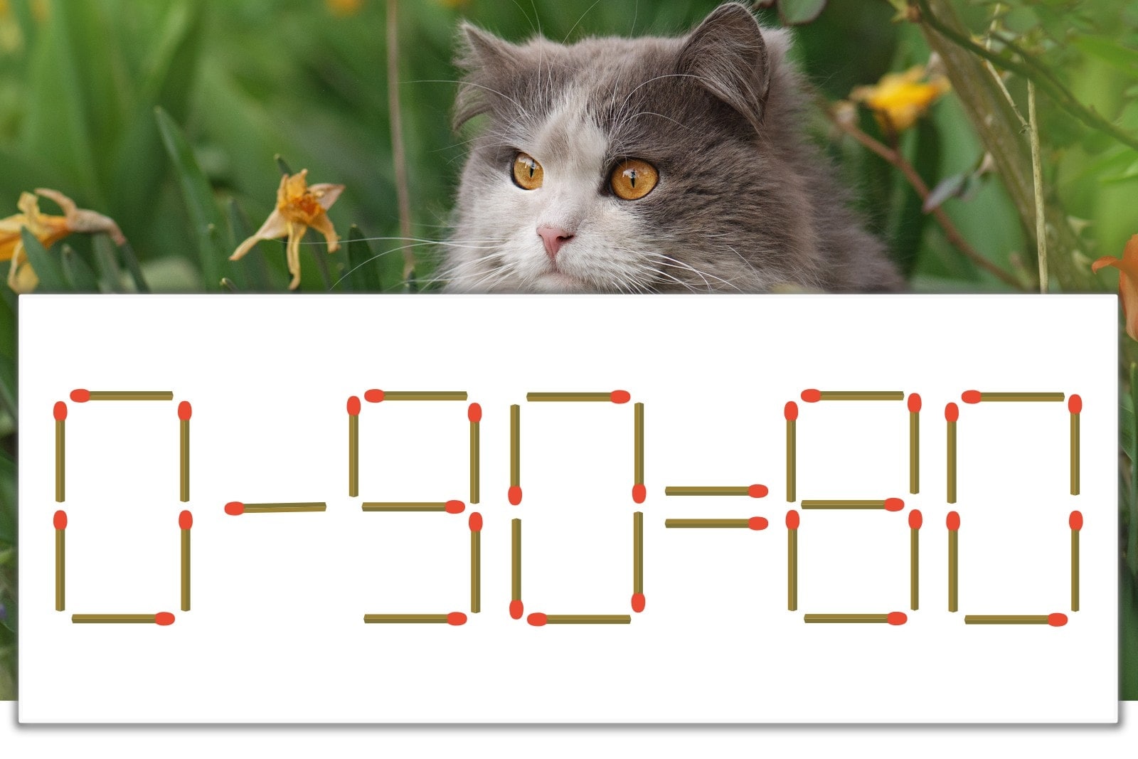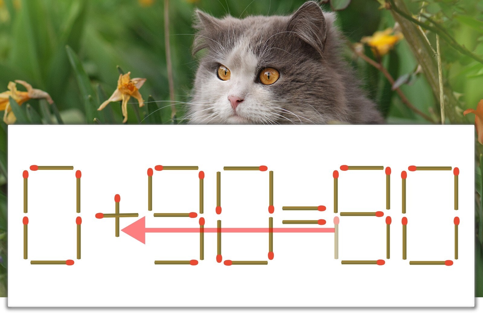 「8」を別の数字に変化させると答えが導き出せます。「8」のマッチ棒を1本移動して、「-」を「+」にしてみましょう。すると、「0+90=90」が成立します。
