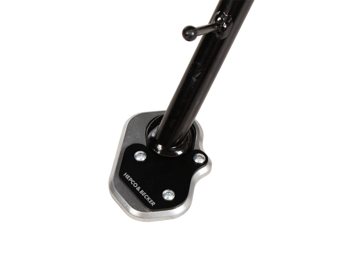 舗装されていない場所での停車で必須アイテムと言えるのがエンラージメントです。このパーツを取り付けることでサイドスタンドの接地面積を拡張し、キャンプ地などで安心してバイクを停車できるように補助します。(すべての場所で使用できるわけではありません)