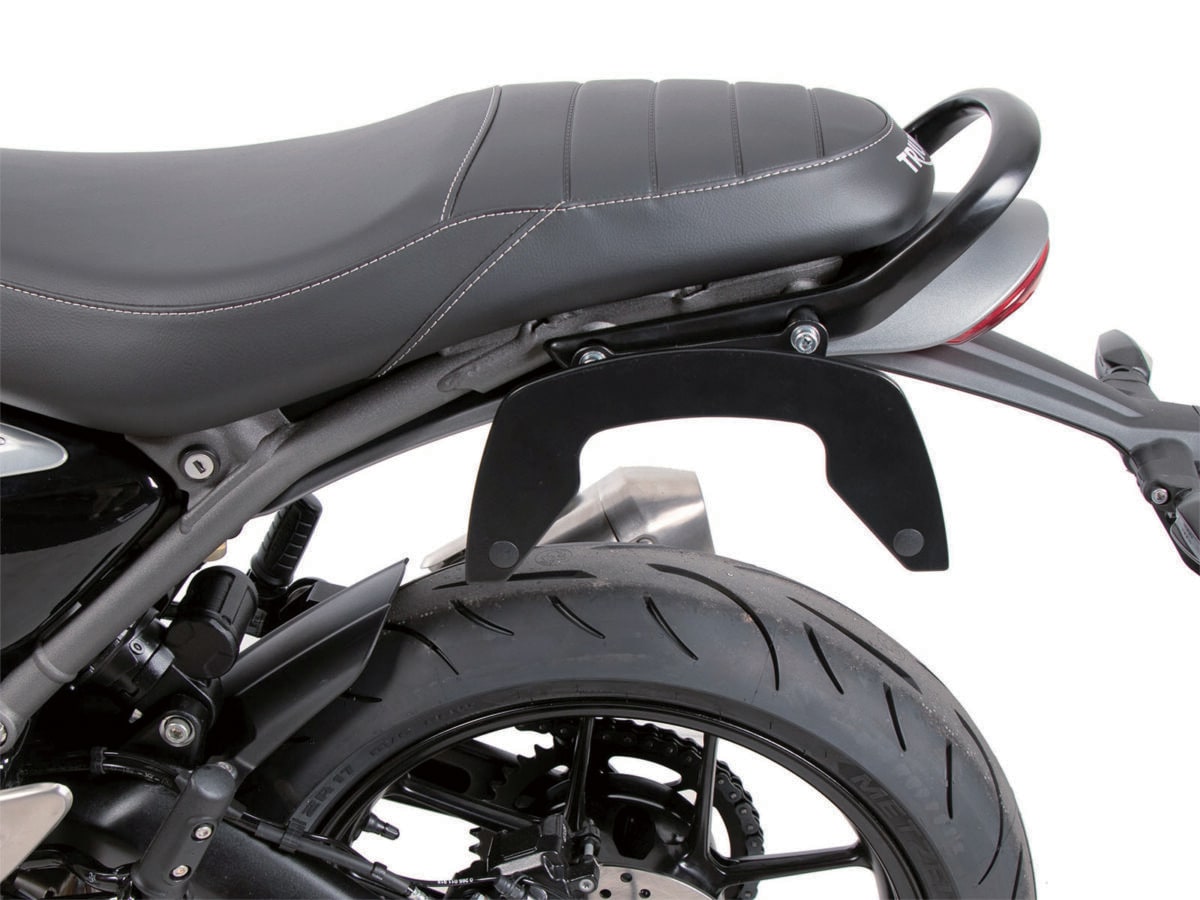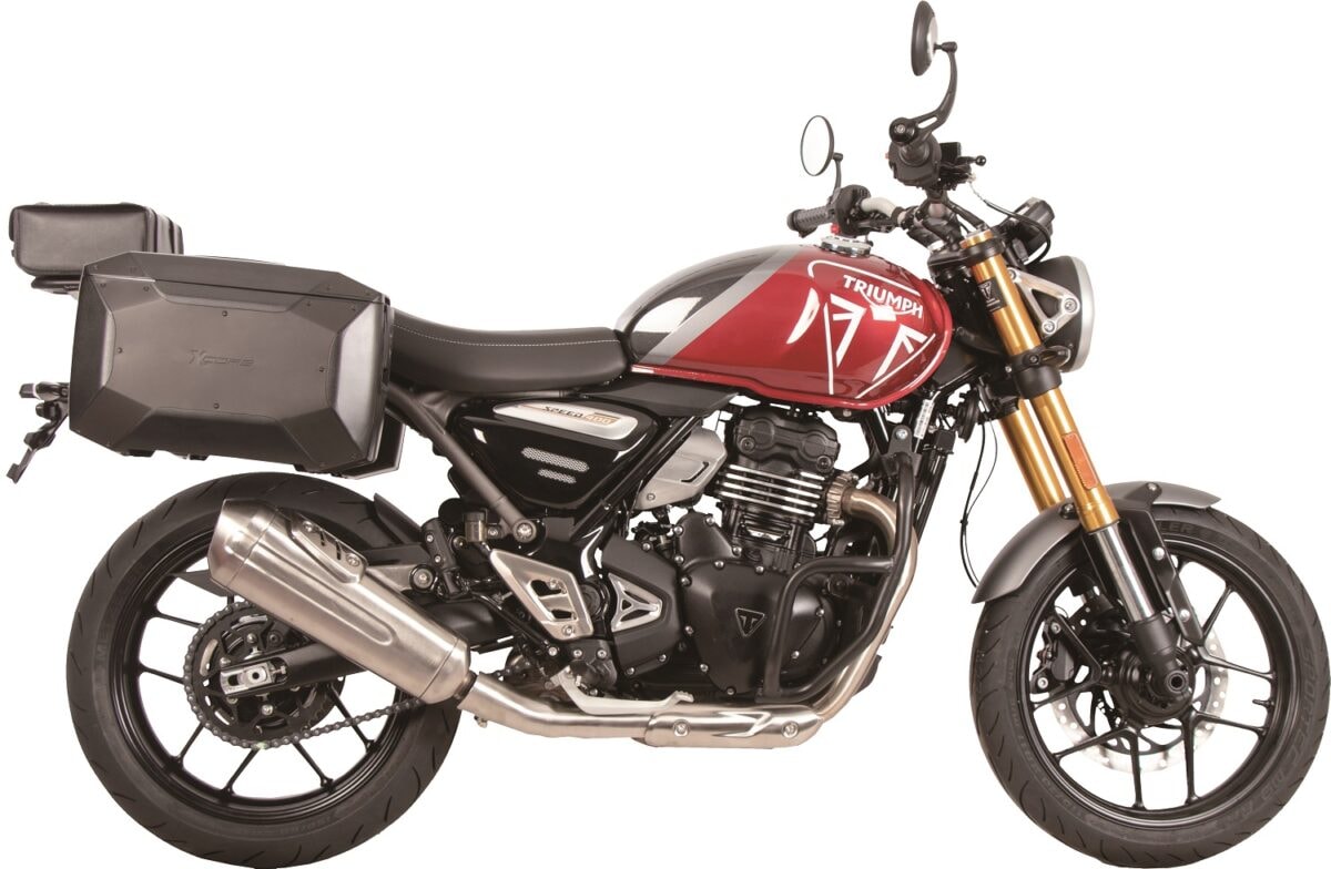 C-BowはHEPCO&BECKER社独自開発の製品で、従来のサイドキャリアよりコンパクトな専用のバッグ&ケースを取付するための車種専用キャリアです。荷物を後部座席より左右に収納できるため、重心を低く安定した走行が可能です。またバッグを外した状態でも、バイクのデザインを崩さないスタイリッシュなデザインがC-Bow最大の特徴です。 写真上はSPEED400にC-Bow キャリア +サイドケース X Core、リアバッグ レガシー ブラック、リアキャリアの装着例です