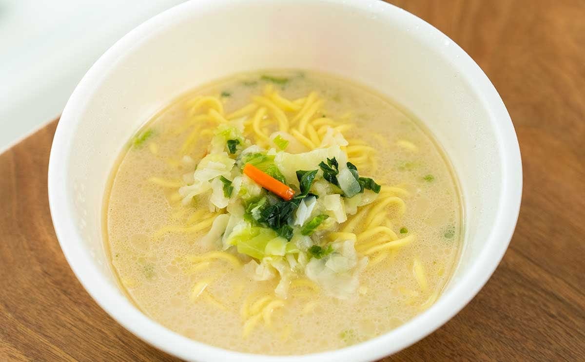ポークの旨みをベースに、野菜や魚介の旨みを加えた白いちゃんぽんスープは、ほどよい香辛料の風味とまろやかな味わいが特長。そのままでもとてもおいしいですが、途中でラー油入りの特製油を加えると、辛みがプラスされて旨辛な赤いスープに変化します。