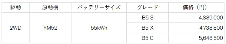 | AUTECH B5 | 2WD | YM52 | 55kWh | B5 G | 6,162,200 |
