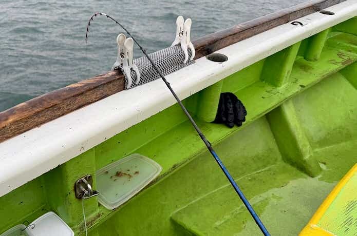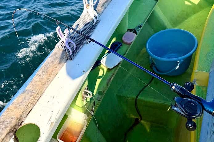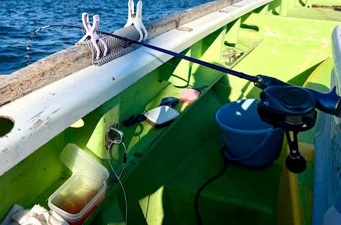 通常の釣り方や50cmほどの間隔でコマセを撒いてタナまで仕掛けを上げたら、ロッドを船縁に置き、アタリを待ちます。