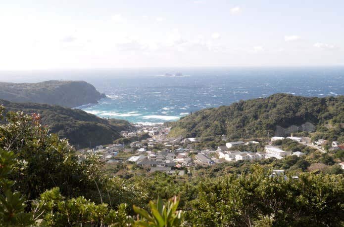 黒島登山口ルートからの開けた景色というのは、この上写真のように海を感じられるものです。見えている町は、神津島の前浜海岸方面の中心地です。