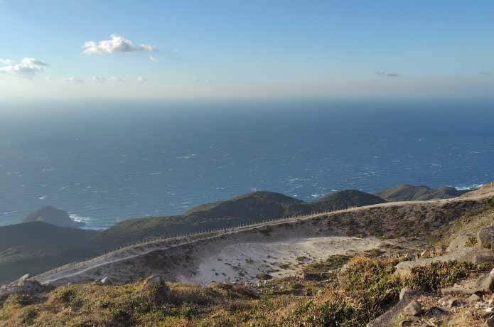 冬の神津島は、西からの季節風が強く吹きます。その強さは日によって、場所によっては風速20mを越える暴風のレベル。私が天上山に登った日は、まさに暴風の日で、テント泊装備の50Lバックパックを背負っていたため、煽られて吹き飛ばされそうになり、四つん這いになった耐風姿勢のまま進まなければならない場所もありました。