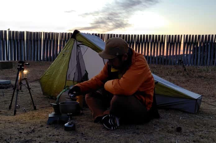冬の日の出時刻はAM6:00台。そこで明るくなり始めたAM6:00に起床。テントを畳んで、荷物を整理して、AM7:00前にキャンプ場をスタートします。
