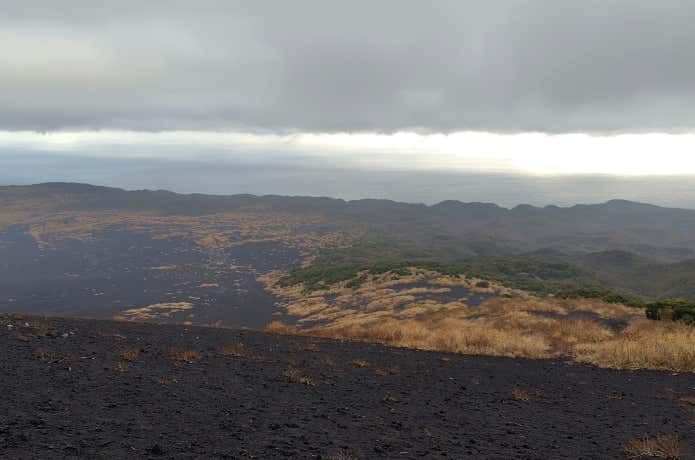 もうひとつは、山頂の東側、外輪山となる櫛形山との間にある砂礫の砂漠からの景色。私が三原山登山の度に撮影するポイントです。上写真で山腹に茶色くまだらに見えるのはススキ。00年代は、もっと範囲が狭かったのですが、最近は山全体を覆ってきています。