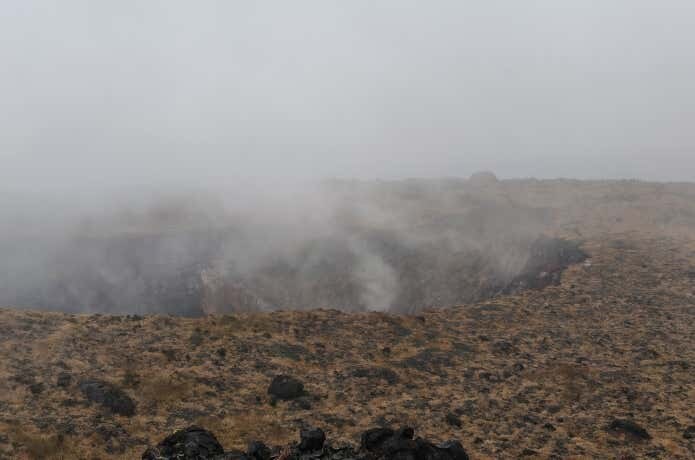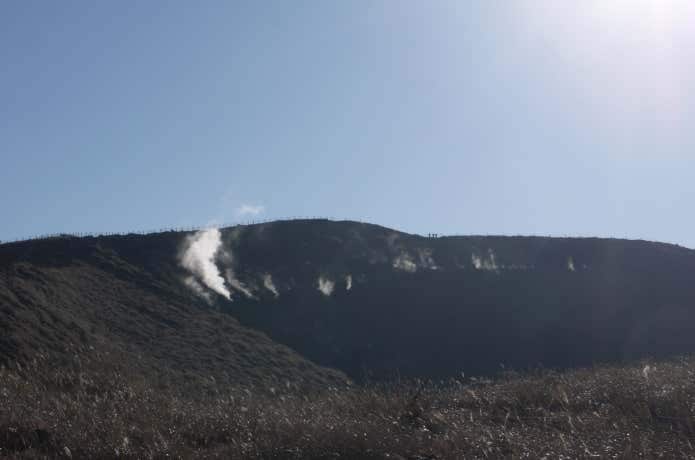 まず、山頂で見られる水蒸気が沸き上がる火口です。噴煙のように見えますが、これは雨水等が熱せられて蒸発した水蒸気だそう。1986年に噴火した「ばかり」の火口の傍を歩いていると思うと少し怖さがあります。