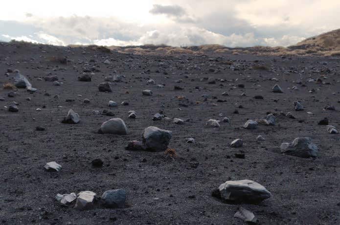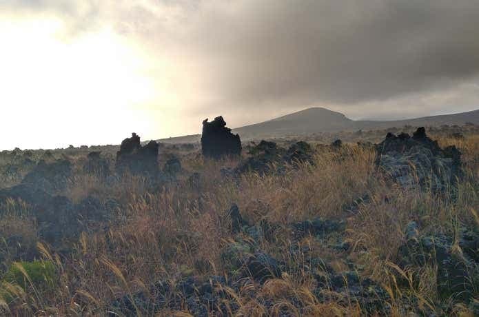 三原山山頂付近は、基本的には砂礫の黒い風景なのですが、少し場所を変えると、雰囲気は大きく変わります。例えばお鉢巡りから南側の表砂漠方面に下りた場所にある、幻の池。雨上がりに出現する池ですが、干上がった時には、アートのように大きめの石が並んでいます。水は、風とは異なる景色を生み出すんですね。