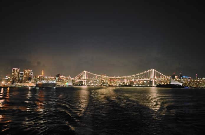 冬はデッキを吹き抜ける風が冷たいですが、竹芝桟橋を出て間もなく、レインボーブリッジをくぐってその全景の背景に東京の夜景を見るまでは、頑張ってデッキにいたいもの。
