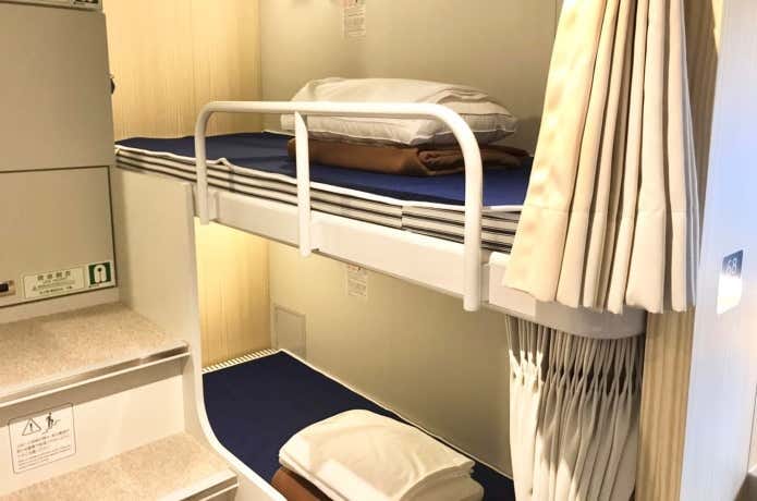 1日目は大型客船・さるびあ丸の船室での宿泊です。冬は空いているので大部屋の2等和室でもよいのですが、カーテンで仕切られてコンセントもある個室的な特2等室(上写真)が、私のオススメです。ちなみに2等和室も共用のコンセントはあります。