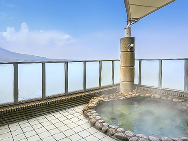 夕暮れ時、桜島に沈む夕日を眺めながら湯に浸かる贅沢な過ごし方もおすすめ。