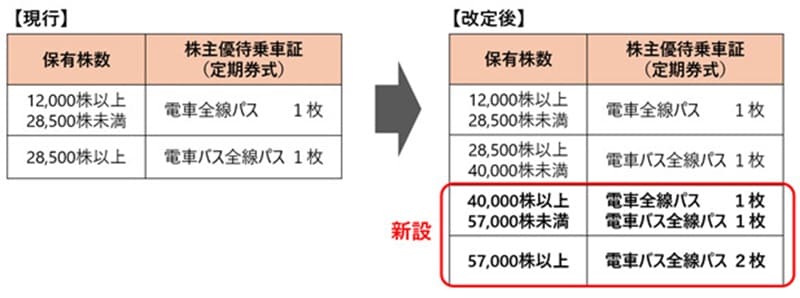 鉄道・バスの利用に関する優待も拡充されます。これまで1枚のみ発行されていた「株主優待乗車証(定期券式)」が、保有株数に応じて最大2枚まで発行されるようになります。例えば、4万株以上5万7,000株未満の保有者の場合、従来は「電車バス全線パス」1枚でしたが、拡充後は「電車全線パス」1枚と「電車バス全線パス」1枚の計2枚を受け取ることが可能になります。さらに5万7,000株以上では「電車バス全線パス」が2枚発行されます。