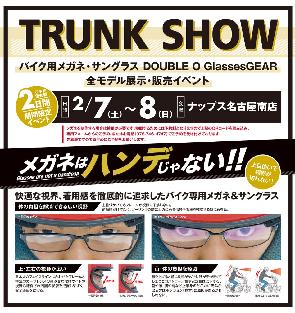 この度、バイク専用メガネの体験ができるイベント、「TRUNK SHOW」が下記にて開催される事となった。