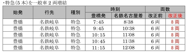 ・名古屋本線:平日朝および土休日朝・昼の特急列車増結(6両→8両)
