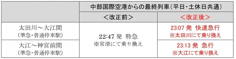 深夜帯についても改善があります。23時台に中部国際空港を出発する快速急行や急行が、太田川駅や大江駅で普通列車へ乗り換え可能なダイヤになります。これにより、空港から太田川~神宮前間の各駅へ帰る際の利便性が高まります。