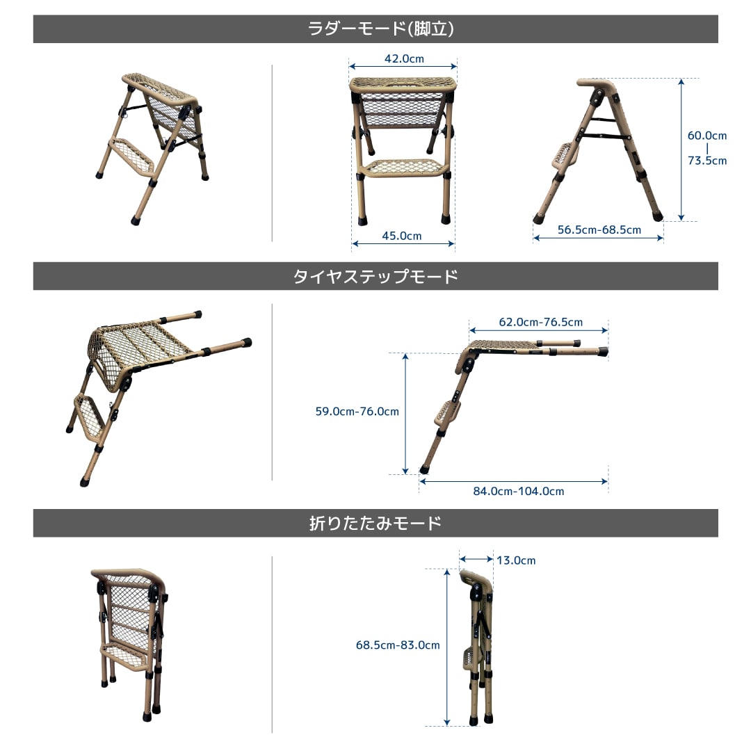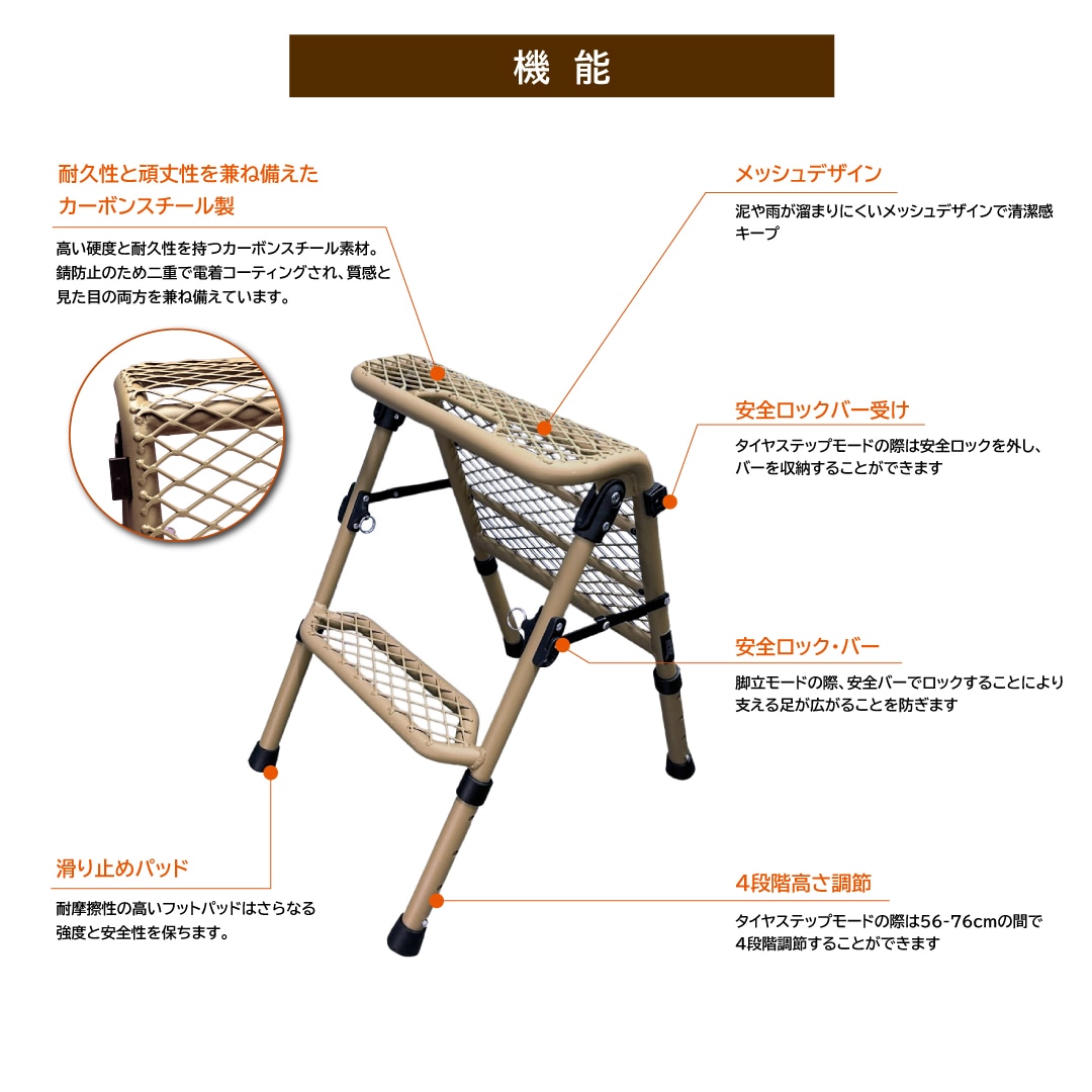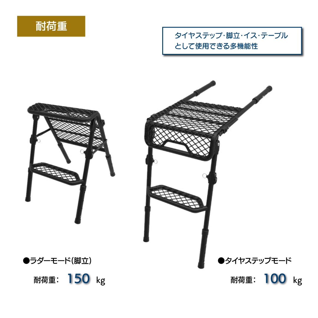 簡易的なイスとしてもテーブルとしても使用できます。安定性、安全を目指したタイヤステップ