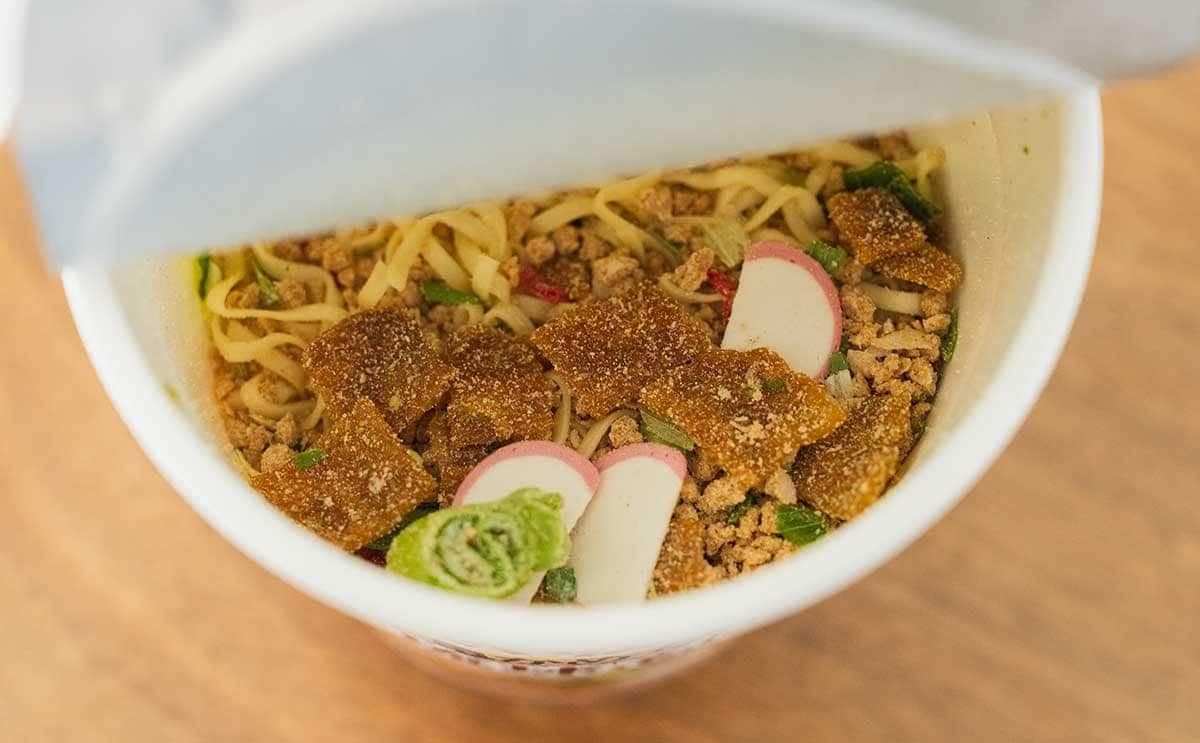 調理方法は、カップの中に熱湯を注いで5分待つだけでOK。粉末スープやかやくなどの袋がないため、作るのが簡単ですね。