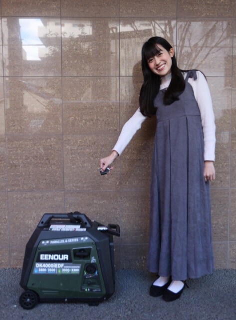 また、リコイルスターター式(ひもを引っ張って始動するタイプ)は相当な力が必要です。でも、この製品はリモコンで楽々スタート可能な上、保管期間が2~6年のLPGボンベも使える。発電量が多く、エアコンと電子レンジの同時使用も余裕です!」