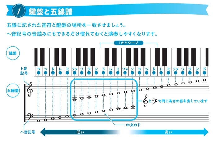 まずは、丁寧に鍵盤と五線譜の解説からスタート。初心者が一番苦労するのが譜読みだが、この本では、前半の音符すべてにカタカナがふってあるから、「次の音は何?」と手を止めることなく演奏することができ、初めて鍵盤楽器に触れる人でもスムーズに学び進められる。