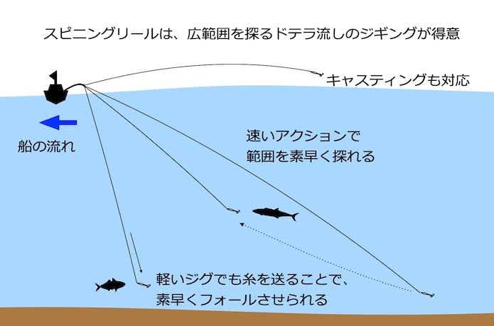 スピニングリール は、船のエンジンを止めて風と潮に乗せて流す“ドテラ流し”のジギングに適します。