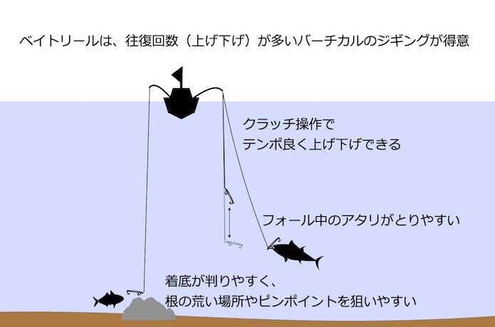 また、潮流が速くて海底が荒い海域は、バーチカル状態で青物を狙うのでベイトリールがメインになります。