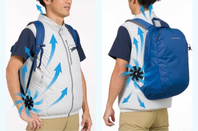 ウェア内部と外部の空気循環を効率よく促す設計により、汗の蒸発を助けて涼しさを実感しやすい構造。ファンは小型バックパックを背負っても空気の流れを妨げにくい位置に配置されており、左は背中側、右は前面側と、あえて風向きを変えることで効果的に送風します。