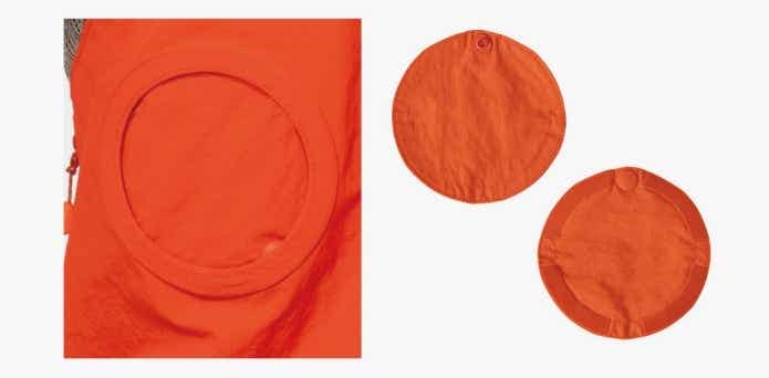 ファン取り付け部にはカバーを装着できるため、通常のウインドシェルとしても使用可能。さらに、襟裏には専用の保冷剤を入れられ、より涼しく着用できます。フードは取り外し可能で、ジャケットとして使えるのもポイントです。