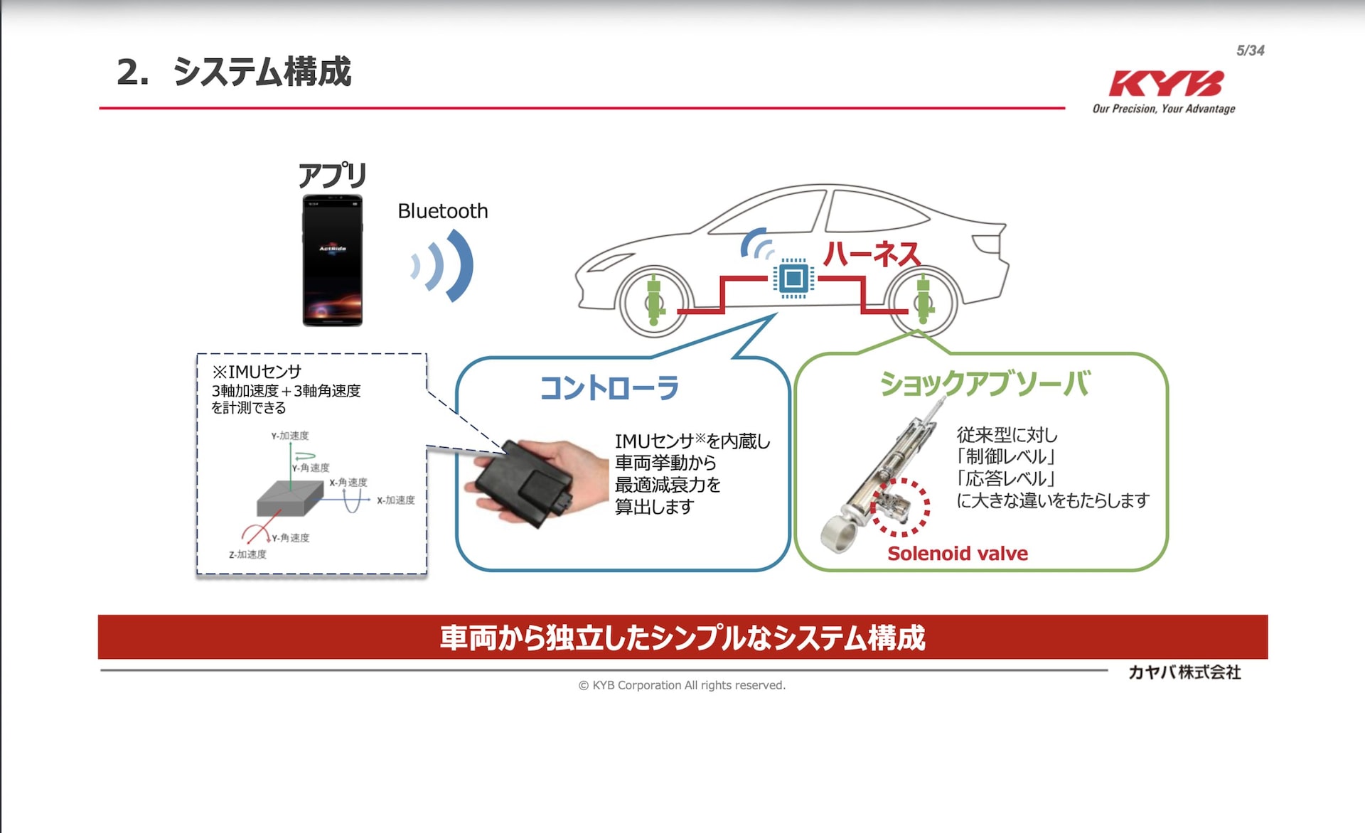 製品構成は連続可変ダンパー本体、減衰を任意に変更できる制御システム、そしてその制御をするためのコントローラーとスマホアプリの3つの領域のものがセットになっている。