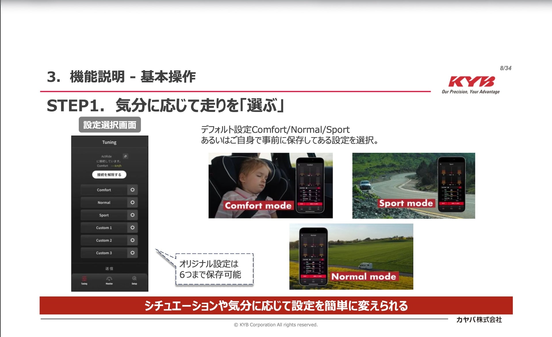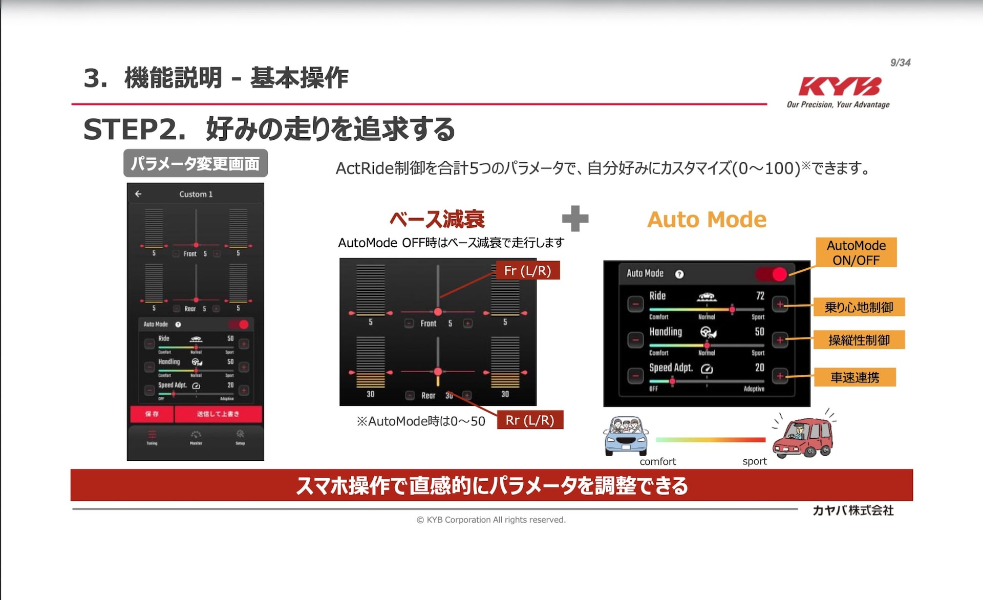 カヤバとしては初のアフターパーツとしているものの、ダンパー本体はメーカー品質で納入実績があるダンパーであり、システムもプジョーとDSが採用していることから、信頼性も高い。したがって、カヤバとしてはスマホ用アプリを開発することで、アフターパーツとして発売することができたというわけだ。