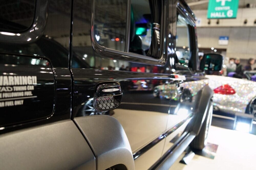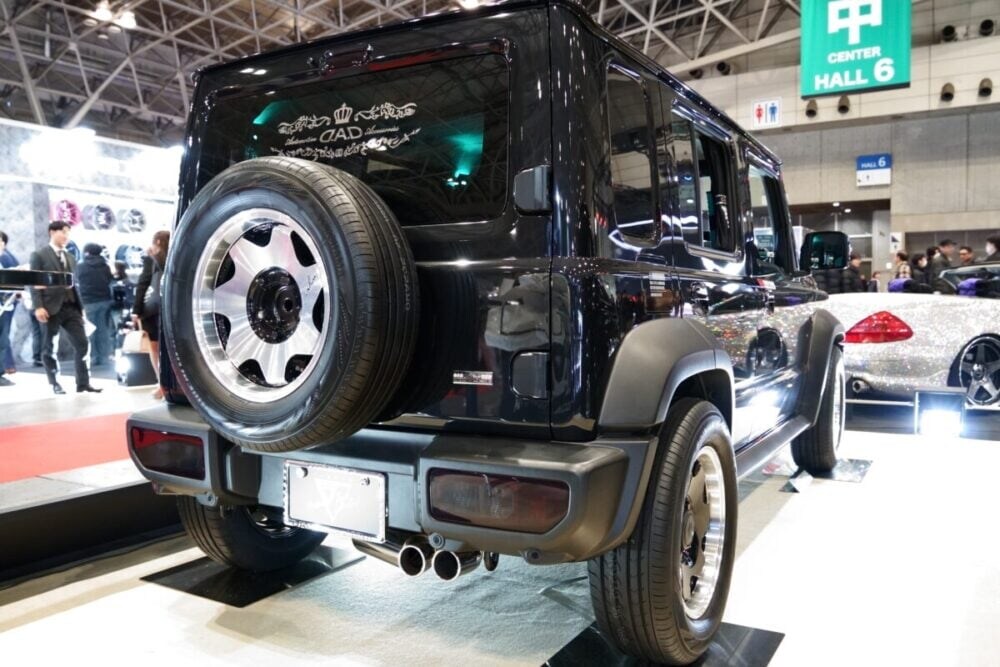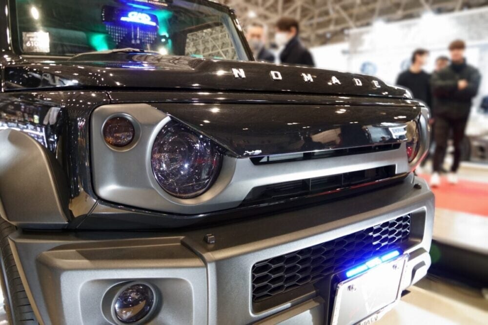 ブースの象徴である金銀の「クリスタルベンツ」が煌々と輝く一方で、黒いボディとスモークレンズによるダークな世界観で異彩を放つのが、ジムニーノマドをベースにした「D.A.D NOMADE」だ。
