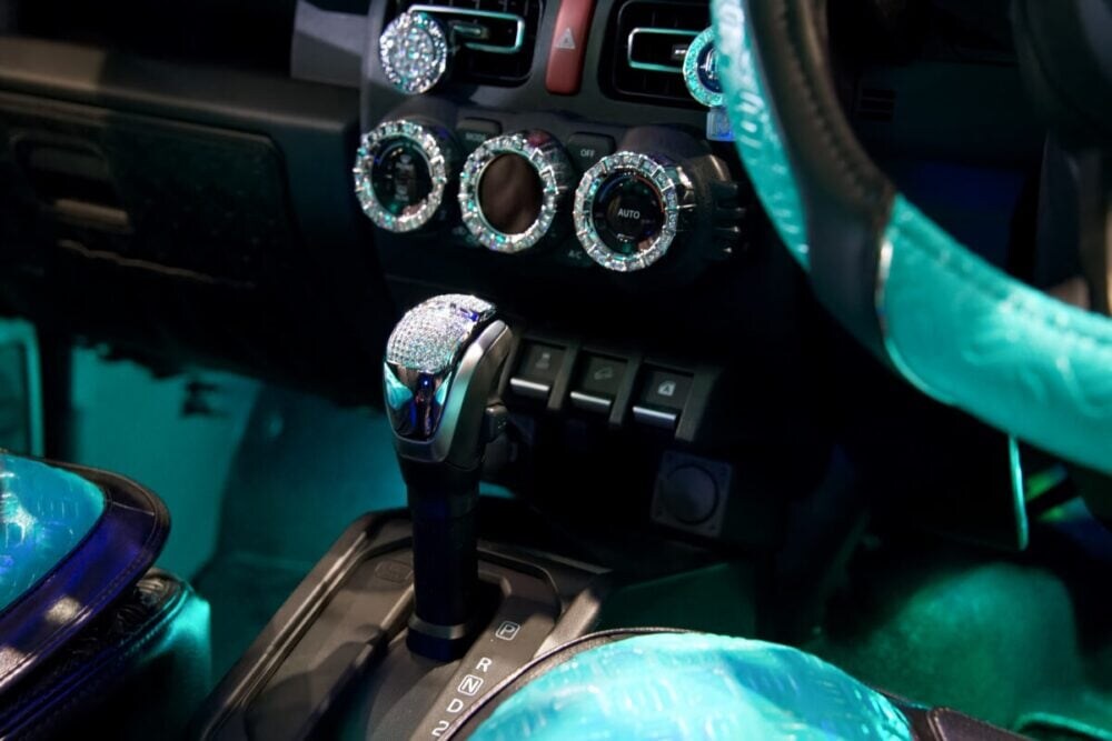 運転席まわりは精細なクリスタルワークによって、ステアリングやシフトノブ、エアコン操作パネルからドアノブまでまばゆい光彩を散りばめる。