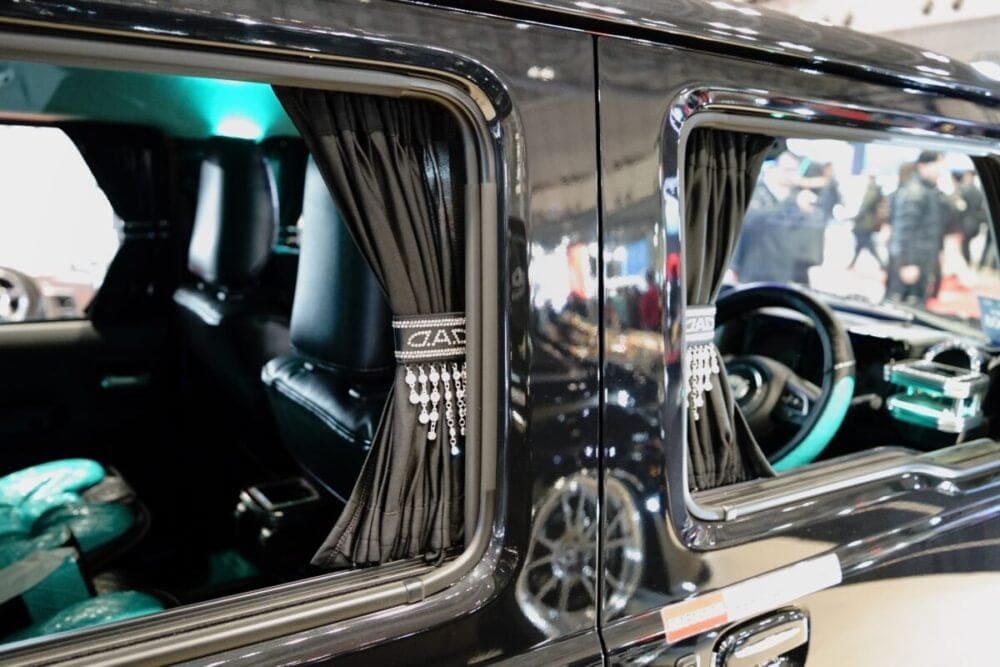 インテリアからエクステリアに至るまで、まばゆいばかりの装飾が実現する荘厳なスタイルは、実に多彩な製品ラインナップによって完成される。定番の車種専用テーブルやシートカバーはもちろん、カーテンやティッシュケースに至るまで、贅を尽くしたアイテムの数々が乗員を優雅に迎え入れる。