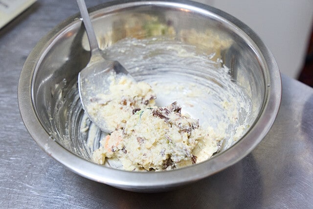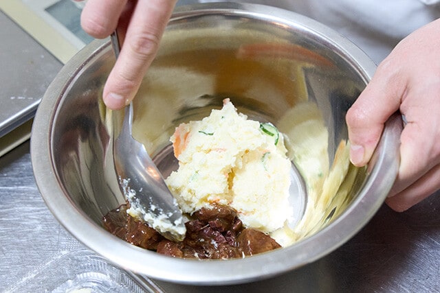 ①ボウルに市販のポテトサラダと8割くらいの量のクジラの大和煮を入れる (残りは盛りつけ時の飾り用に使う)