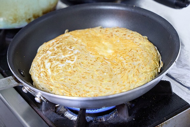 ③焼き上がったらフライパンの縁から醤油を回しかける