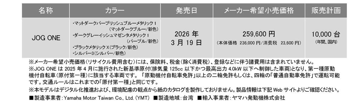 ヤマハ発動機販売株式会社は、新基準原付に適合したスクーターの新製品「JOG ONE」を2026年3月19日に発売する。