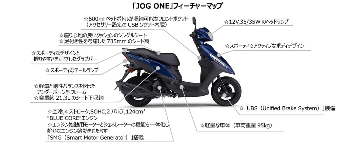 ヤマハ発動機販売株式会社は、原付一種(第一種原動機付自転車)に新たに追加された区分基準(以下、新基準原付*¹)に適合したスクーターの新製品「JOG ONE(ジョグ ワン)」を3月19日に発売します。