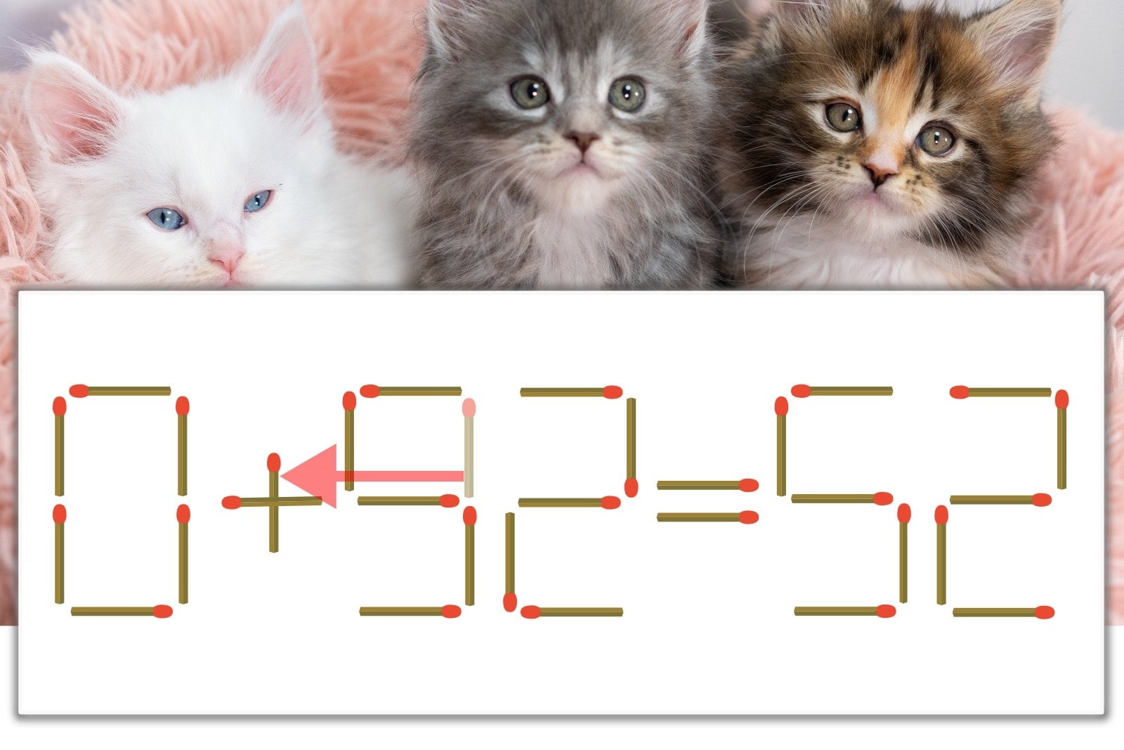 「9」を別の数字に変化させると答えが導き出せます。「9」のマッチ棒を1本移動して、「-」を「+」にしてみましょう。すると、「0+52=52」が成立します。