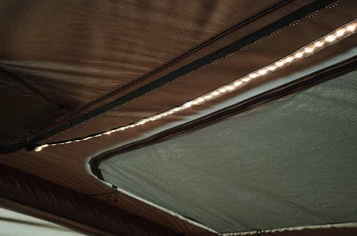 先述の通りテープライトとコードを含めた全長は約190cm。大型の2ルームテントの場合は、壁面の端まで届きません。別途ガイロープなどを用意し、長さを延長して使用する必要があります。